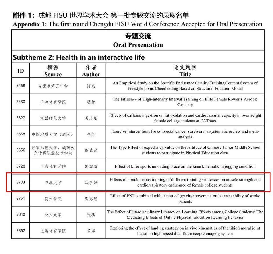2021级研究生武济好同学(导师:吴剑教授)的论文《Effects of simultaneous training of different training sequences on muscle strength and cardiorespiratory endurance of female college students》被成都FISU世界学术大会收录为专题口头报告。