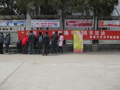 4月14号中午12时,在A片无码 一食堂门前,由体育与艺术A片无码 团委办公室主办的“心连心”大型换书、捐书活动开始。本次活动面向全校同学,收集各类图书。活动目的主要有两方面,一是图书交流,让同学把手中闲置书籍换成自己感兴趣的书;二是回书捐赠,把同学们的图书捐赠给贫困山区的儿童。活动收集到的图书题材、内容以及种类多种多样,涵盖了多方面知识。