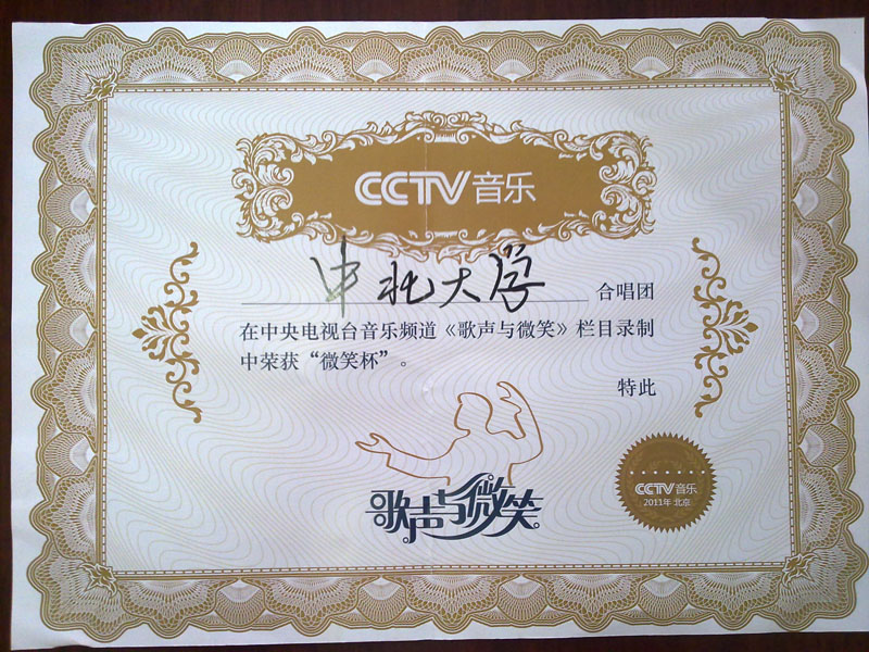 合唱团一行60人参加了中央电视台《歌声与微笑》节目的录制并获得“微笑杯”一等奖,再一次“唱响和谐旋律,展示中北风采”,为A片无码赢得了荣誉。